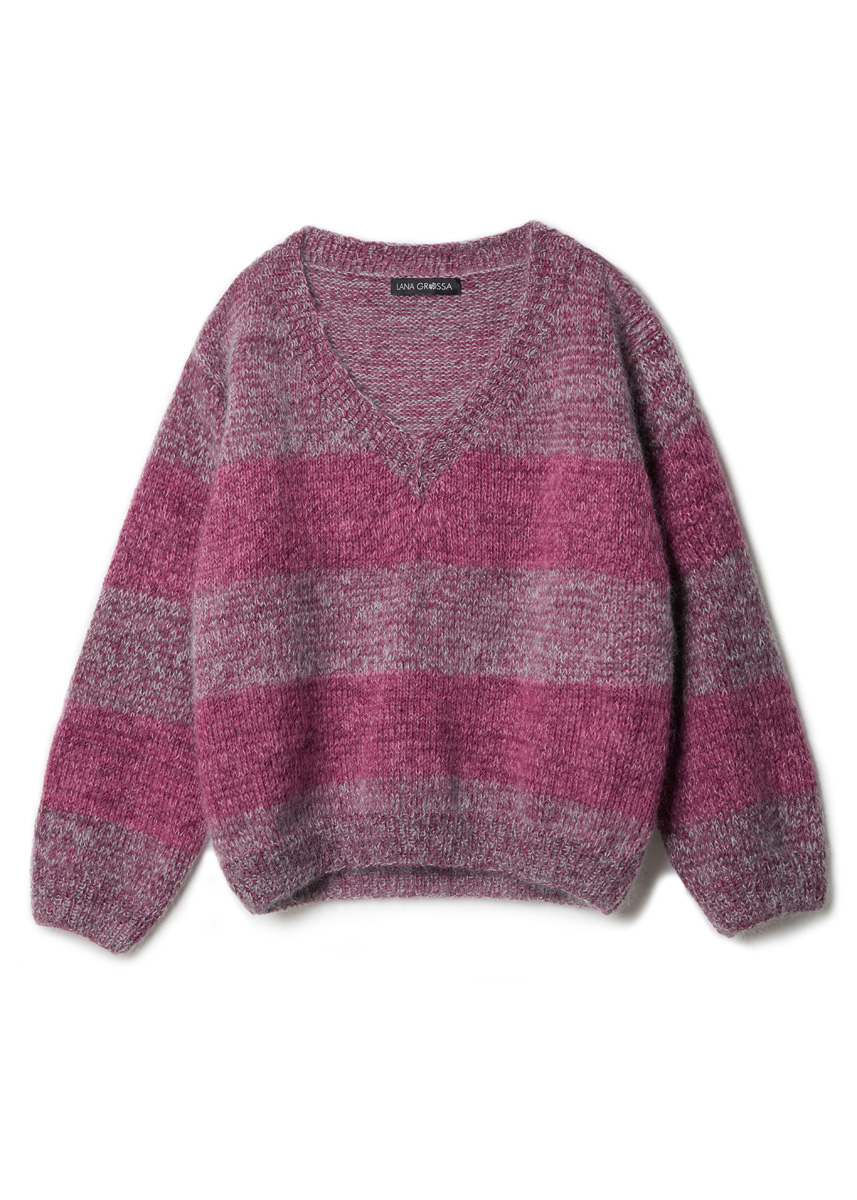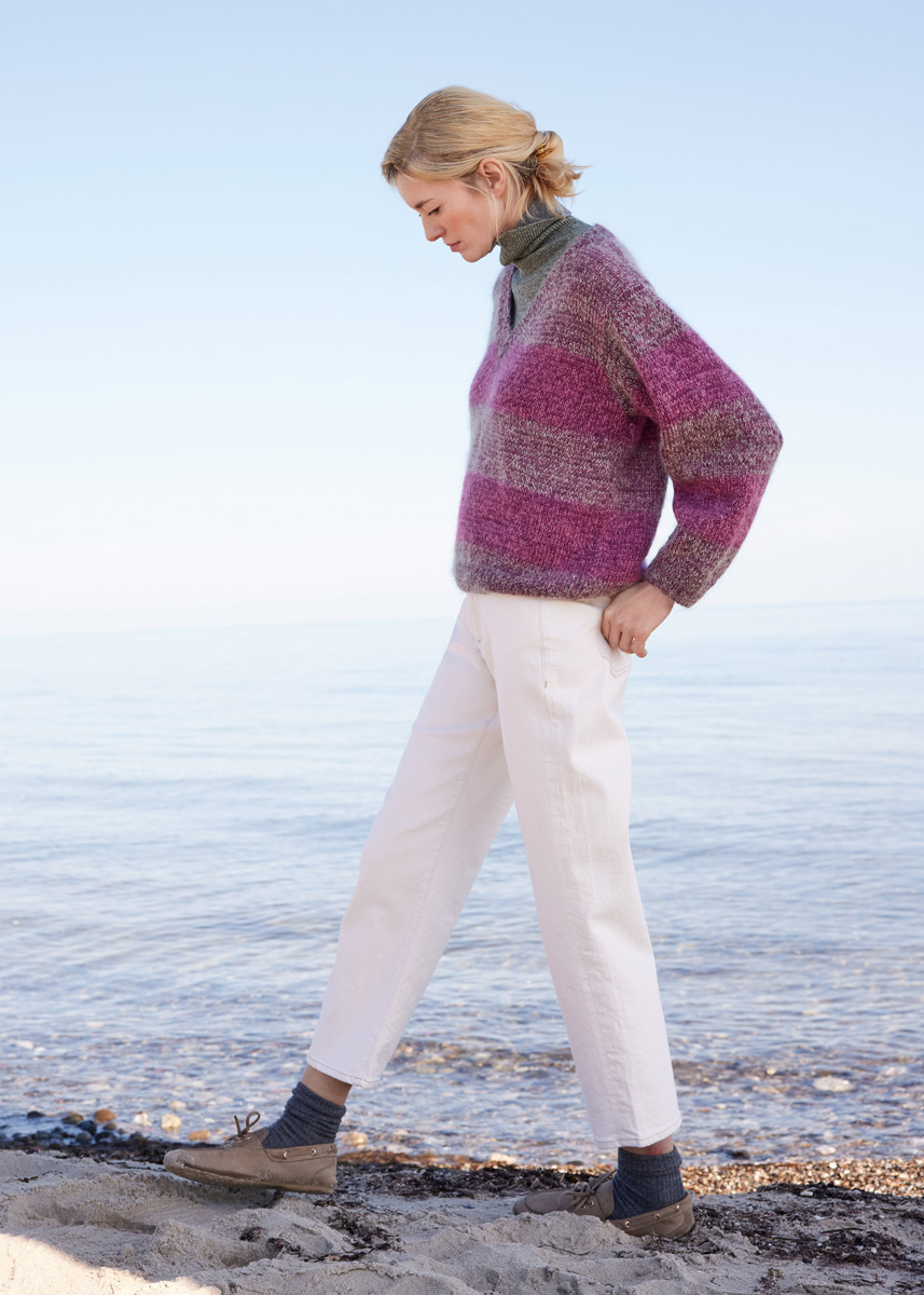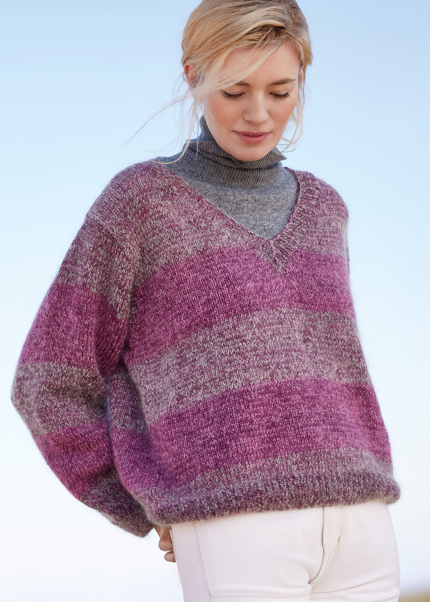 Garn: Lana Grossa Cool Wool Vintage (100 % ren ny ull (merino extrafine), LL = ca. 125 m/50 g), 400 (450 – 500 – 550) g plomme (frg 7365), Lana Grossa Silkhair (70% mohair (superkid), 30% silke, LL = ca. 210 m/25 g), 75 (100 – 100 – 125) g perlehvit (frg 58) og 75 (75 – 100 – 100) g rosa (frg 162) Pinner: Nr. 4,5 og 5, rundpinne (60 cm) nr. 4,5 Info: Strikk genseren med en tråd Cool Wool Vintage sammen med en tråd Silkhair.