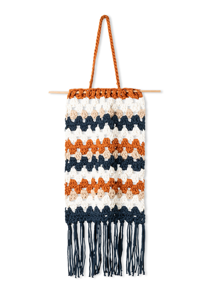Lana Grossa-kvalitet „The Tube” (60 % bomull, 40 % nylon, løpelengde = ca. 114 m/200 g): hver ca. 200 g creme (farge 2), beige (farge 17), rust (farge 6) og nattblå (farge 21); 1 heklenål nr. 9,1 rundstav i tre, ø 1 cm, ca. 40 cm lang.