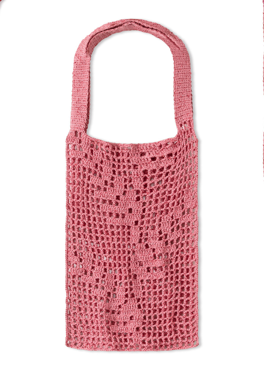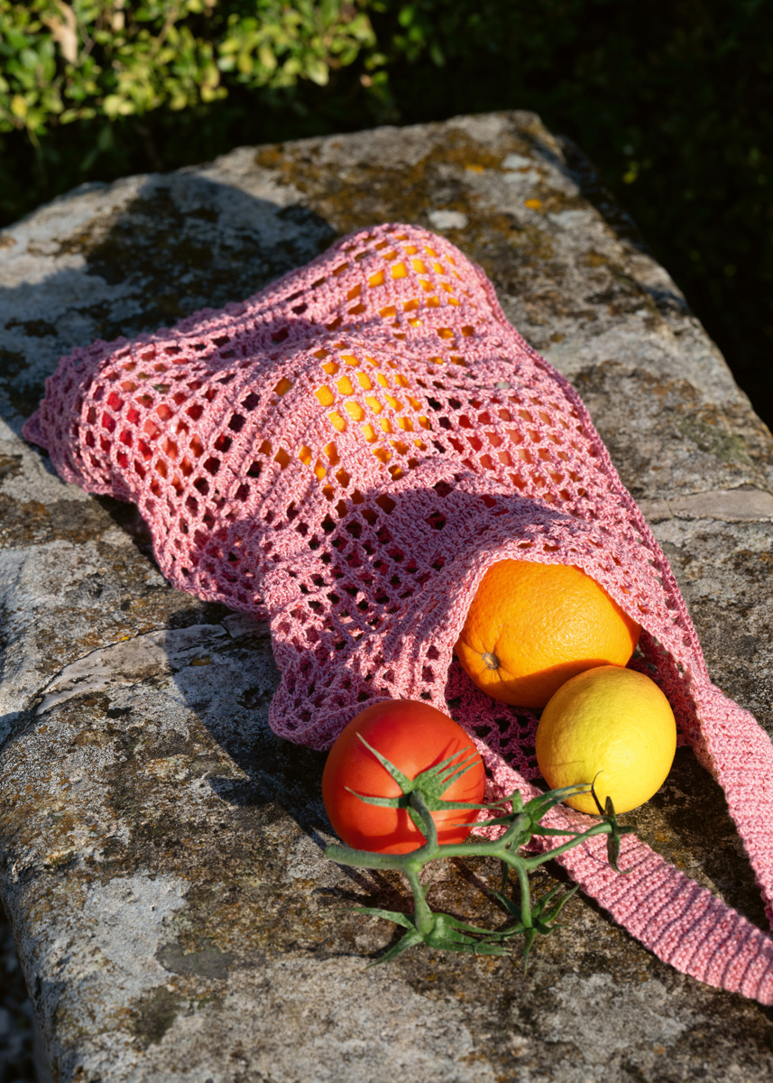 Garn: Lana Grossa «Filo Paillettes» (55 % polyester, 39 % bomull, 6 % polyamid, LL = ca. 220 m/50 g): Ca. 100 g laks (frg 6). Heklenål: Nr. 3