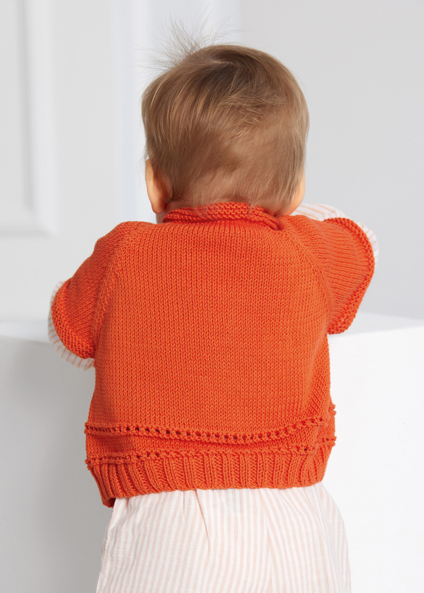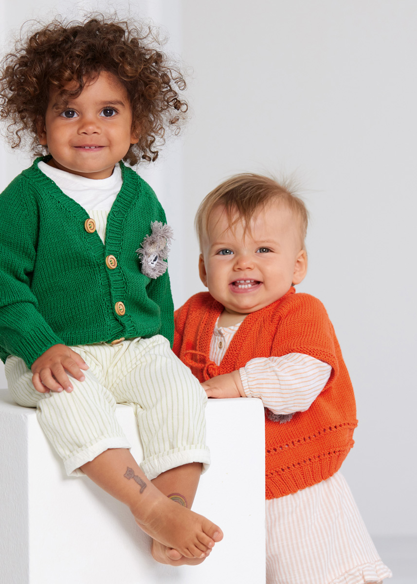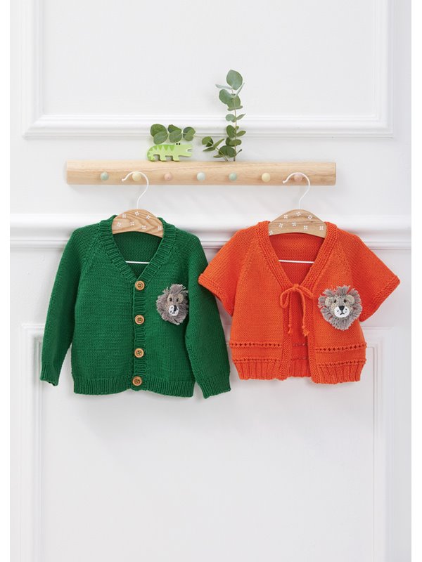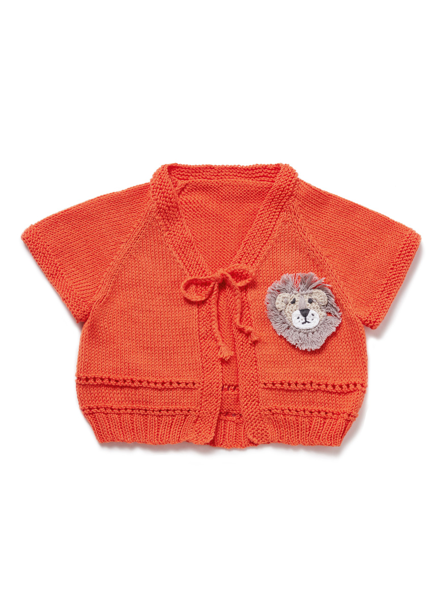 Lana Grossa-kvalitet ”Cotton Love” (100 % bomuld (øko), løbelængde = ca. 170 m / 50 gr.): 100(100-100-150) gr koral (fv 2), og til løvemotivet: 50 gr taupe (fv 20), sort (fv 9), hvid (fv 12) og beige (fv 18), rundpind nr. 3½ og 4, hæklenål nr. 3.