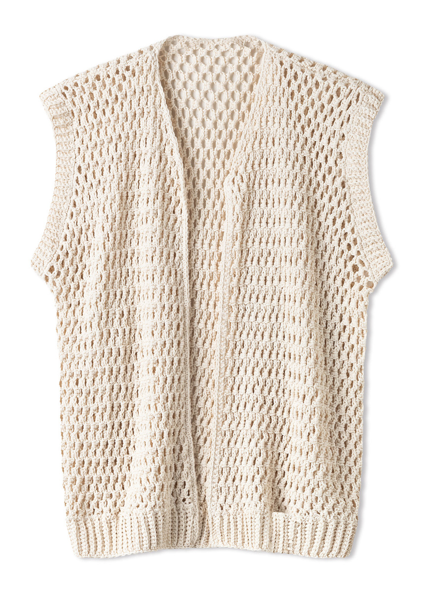 Garn: Lana Grossa «Gioia» (75 % bomull, 25 % polyamid (resirkulert), LL = ca. 110 m/50 g): Ca. 400 (400 - 450 - 450) g krem (frg 2) Heklenål: Nr. 4 Vesten blir heklet på tvers, begynn i en side.
