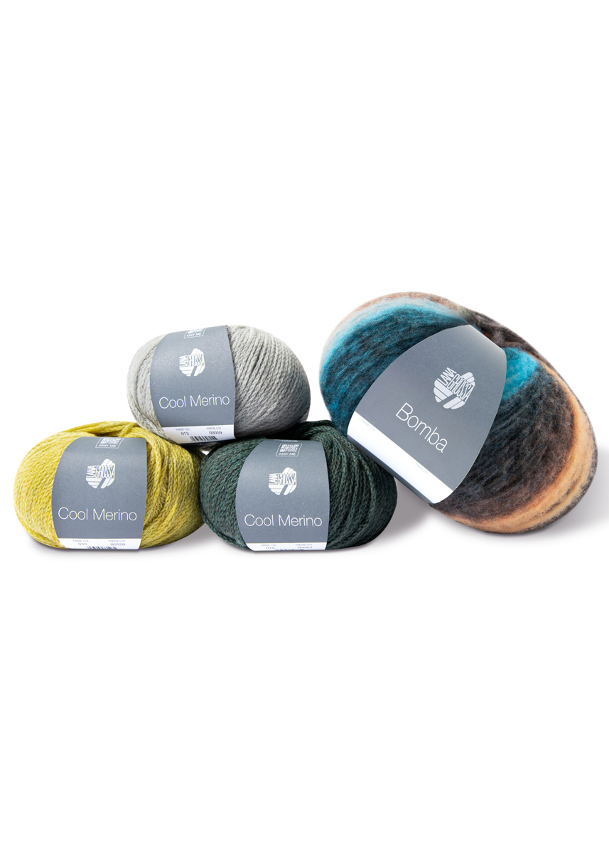 Lana Grossa-garn, "Bomba" (85 % extrafin merinoull, 15 % polyamid, 290 m/100 g): 100 g (1 nøste) i farge 7 (fersken/hvit/lys/mørkegrønn/grå petrol/brun/turkisblå);