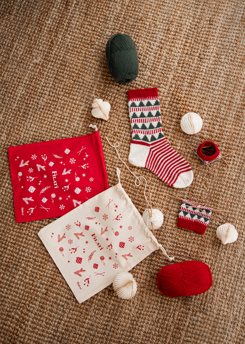 Enten som stilfull gaveinnpakning eller som en trofast følgesvenn til ditt neste strikkeprosjekt – disse omsorgsfullt designede prosjektposene i festlig julestil er allsidige og garantert å spre julestemning.