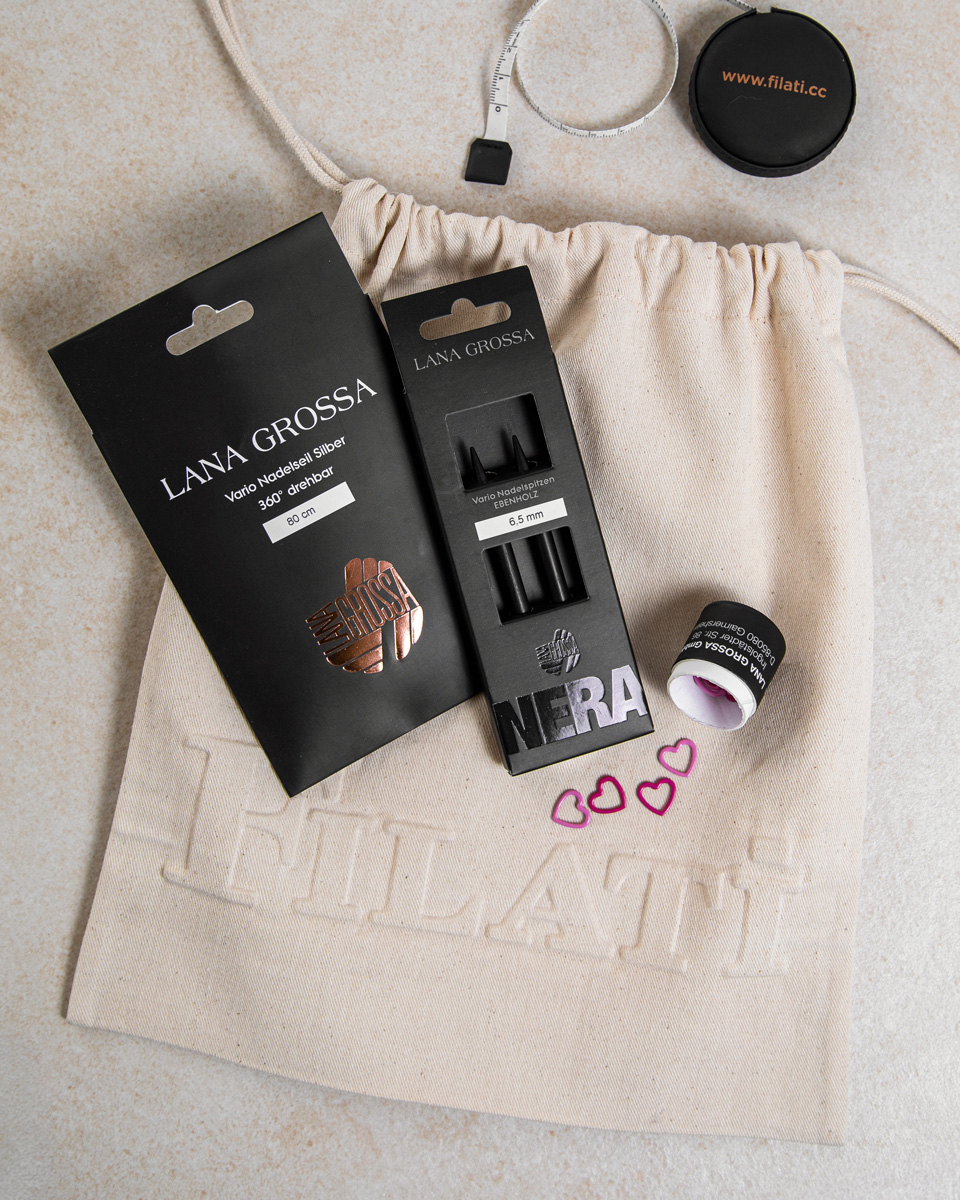 Ull, pinner og tilbehør får enkelt plass – enten du er på farten, på kafé eller på reise. Den praktiske snørelukkingen holder alt trygt samlet, slik at du alltid er klar: bare ta den, åpne og strikk i vei.